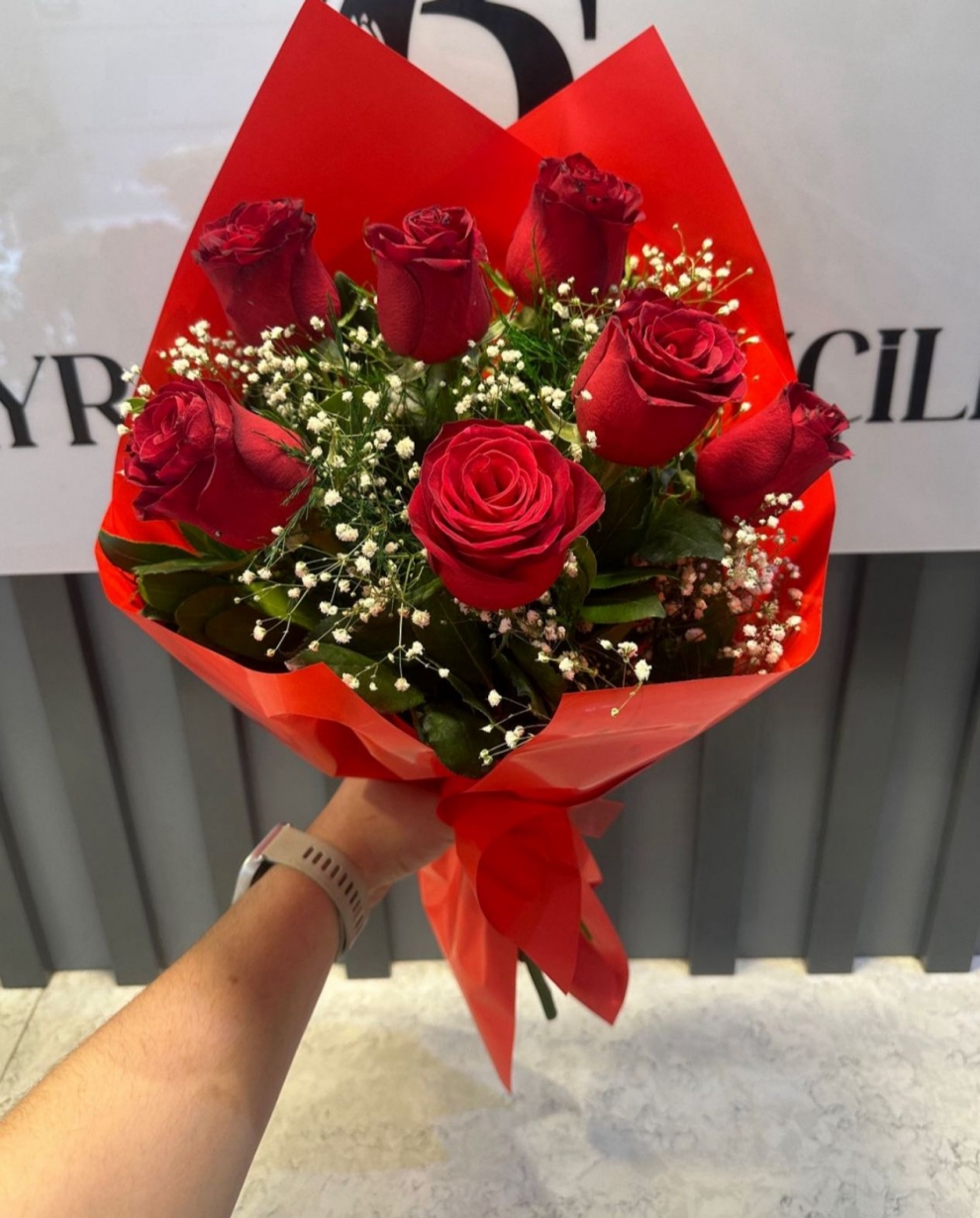 7 adet kırmızı renk gülden buket, stok ve mevsim durumuna göre daha açık veya daha kapalı olabilir güller.