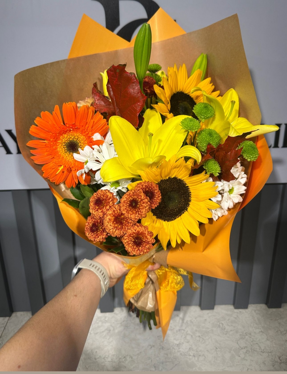Lilyum, kasımpatı ve papatya, gerbera ile hazırlanmış buket stok durumuna göre çiçek ve ambalaj rengi değişiklik gösterebilir.