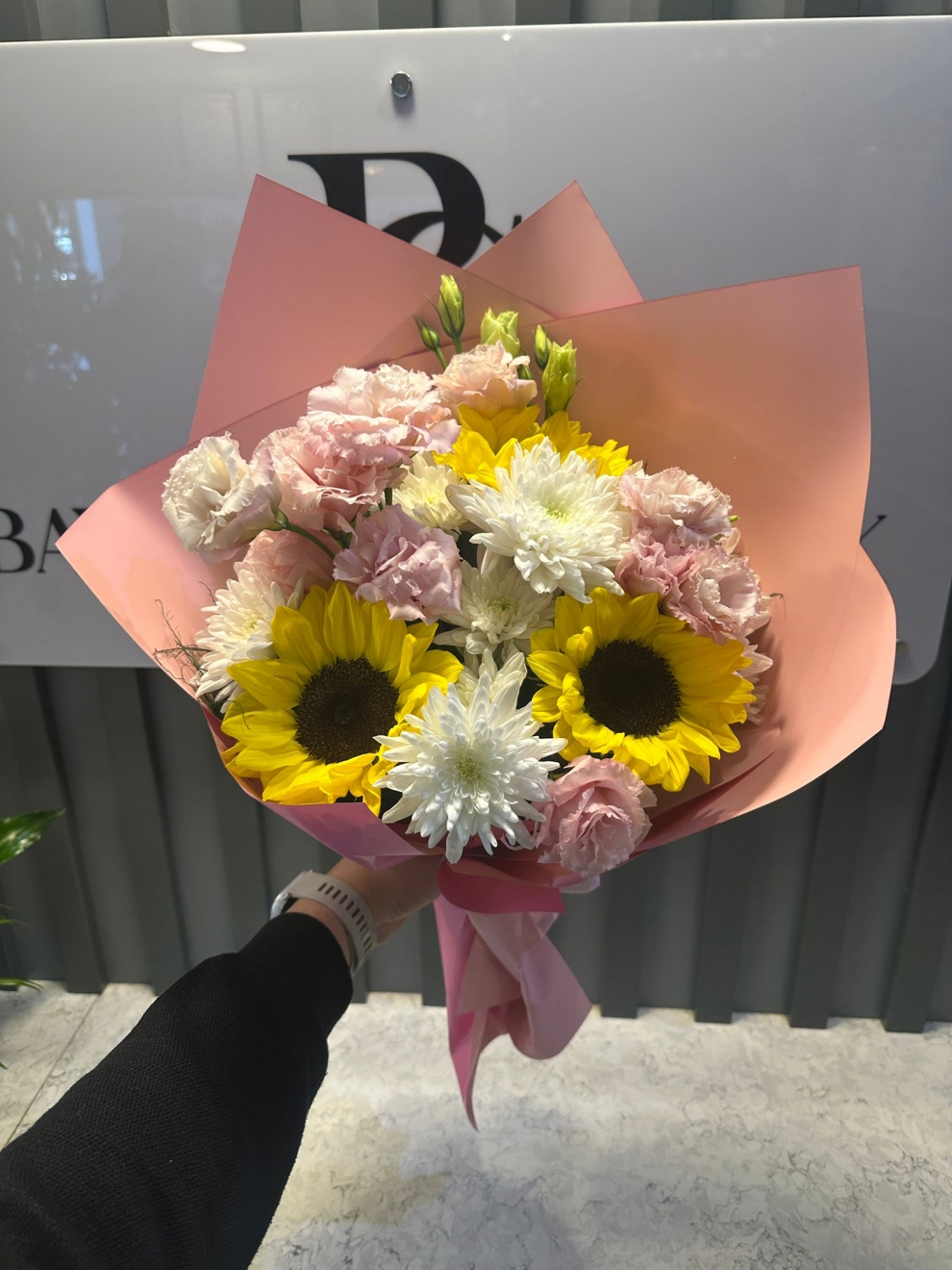 Mevsimlik buket 2 demet kırzantem biçme, 3 dal gerbera, ve hüsnü yusuf