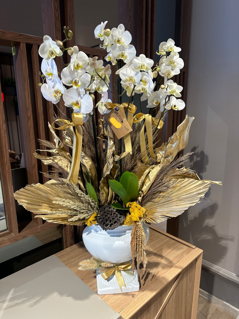5 dal beyaz orkideden hazırlanmış özel sunumu ile orkide arajman.